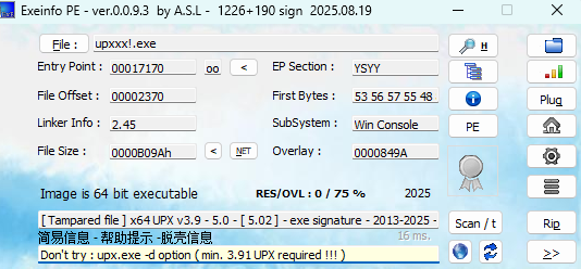 [ Tampared file ] x64 UPX v3.9 - 5.0 - [ 5.02 ] - exe signature - 2013-2025 - http://upx.github.io ,