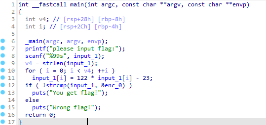 - 观察循环逻辑:逐字节处理输入,计算 enc_byte = (ch * 0x7A - 0x17) & 0xFF,然后与 .data 里的 27 字节常量比对,全匹配则输出成功。