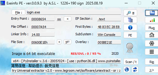 首先还是进行exeinfo的初步分析,发现是使用PyInstaller进行打包程序