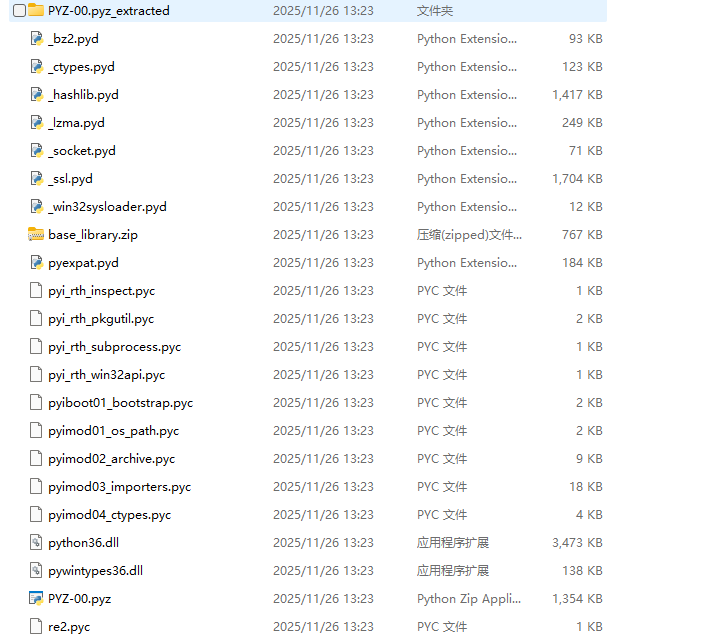 之后使用pyinstxtractor将exe文件反编译后生成下面的一堆文件,其中真正需要进行反编译的使用PYZ-00.pyz_extracted文件夹中的文件,若里面内容是空的说明,你用的python版本不正确,pyinstxtractor会向你说明情况