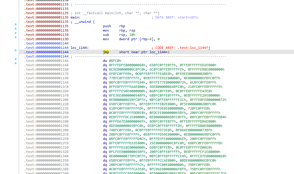 开始就无法分析,推测是jmp花指令导致IDA 认为既像代码又像数据,因此无法进行分析