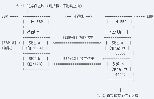 void __stdcall fun2(int a, int b) { //演示如何利用__stdcall漏洞进行内存篡改
